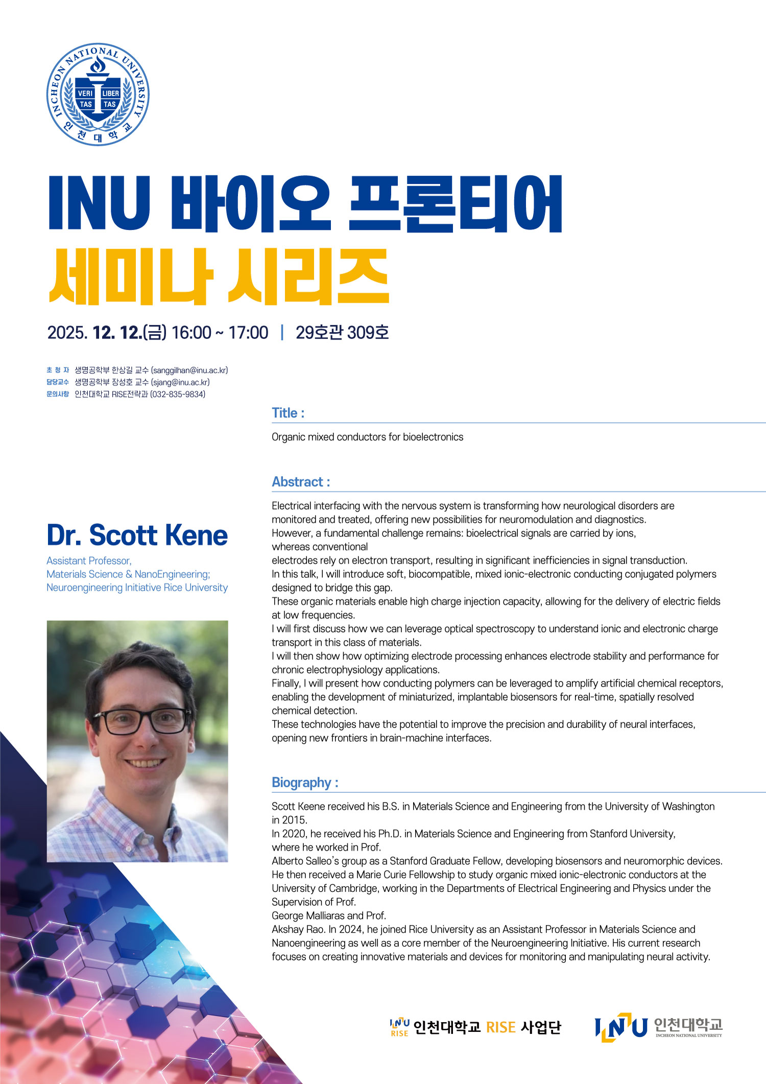 *연사정보: Dr. Scott Kene (Assistant Professor, Materials Science & NanoEngineering; Neuroengineering Initiative Rice University)